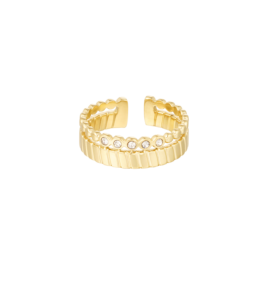 Shop nu deze prachtige gouden dubbele ring met streepjes en kleine witte steentjes! De perfecte ring om enkel te dragen of juist te combineren met meerdere trendy ringen. Ook leuk om deze prachtige ring te combineren met meerdere sieraden met steentjes. De ring is gemaakt van stainless steel in combinatie met strass steentjes en is one size. Doordat deze ring one size is, kun je de ring perfect vormen naar elke vinger, ideaal. De ring is verkrijgbaar in de kleuren zilver/wit en goud/wit.