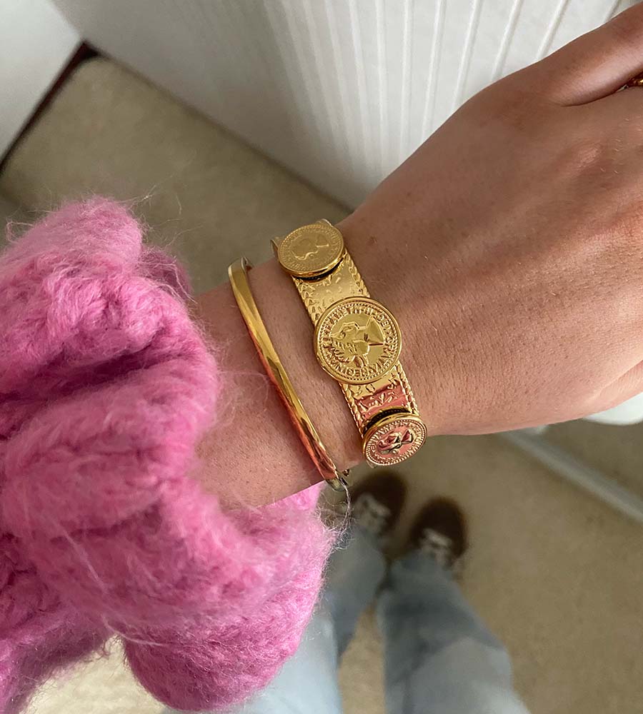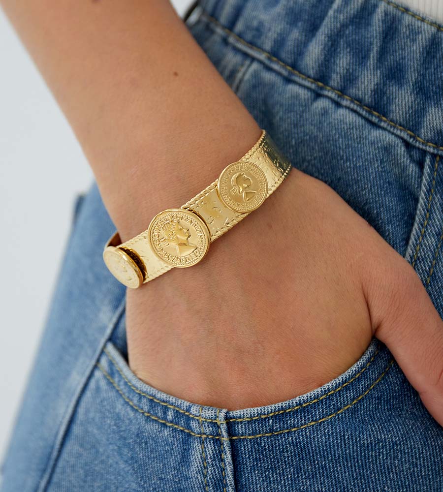 Wauw! Hoe tof is deze gouden armband met coins. Erg trendy en mega leuk te combineren met meerdere sieraden en accessoires. Deze prachtige armband is gemaakt van Stainless steel.